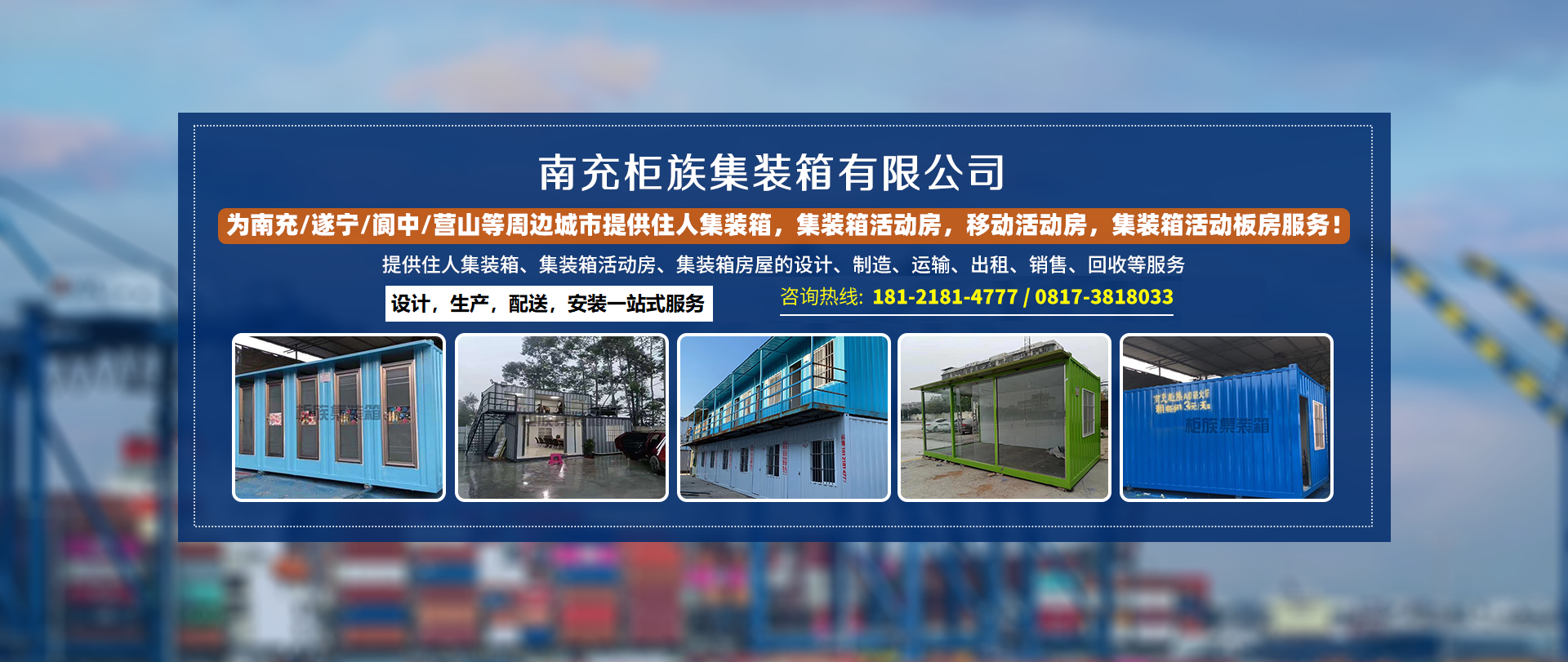 南充柜族集裝箱有限公司是一家為南充/遂寧/閬中/營山/蓬安/南部/西充等周邊城市提供住人集裝箱,集裝箱活動房,移動活動房,集裝箱活動板房服務(wù)!本公司專業(yè)服務(wù)南充住人集裝箱、南充移動活動房、南...